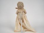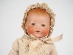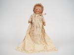 Bébé nouveau-né de fabrication allemande tête porcelaine marqué AM 351/3K, bouche ouverte avec 2 dents, yeux basculant bleus, corps composition, 5 pièces jolis vêtements anciens 33 cm.