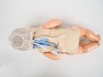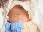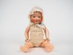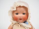 Bébé nouveau-né de fabrication allemande tête porcelaine marqué AM 351/6K bouche ouverte avec 2 dents, yeux basculants bleus, corps composition 5 pièces 45 cm (un bras accidenté).