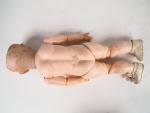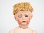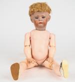 Bébé de caractère de fabrication allemande Kammer et Reinhardt, moule 115A, taille : 42 cm, tête en porcelaine en bel état, corps composition articulé, jolies chaussures anciennes, yeux basculants avec écaillures aux paupières.