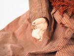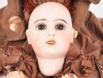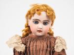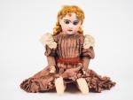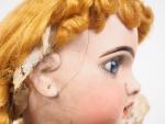 Poupée de fabrication francaise de marque Jumeau période SFBJ, tête gravement accidentée manque les dents, marquée tête Jumeau 8, corps composition articulé Jumeau, jolie robe ancienne, taille 48 cm, on y joint une tête SFBJ moule Jumeau sans marque taille 8, yeux fixes brun, bouche ouverte, fêl au front et points noirs sur les joues.