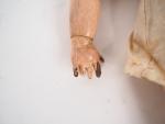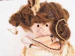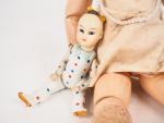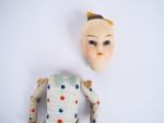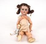 2 poupées dont 1 marquée DEP bouche ouverte T5 yeux fixes bleus, corps composition articulé, 38 cm on y joint une curieuse mignonette porcelaine accidentée tête pleine et corps porcelaine.