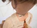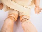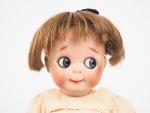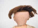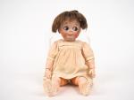 GOOGLY. Tête porcelaine de fabrication allemande marquée : JDK 221 Ges.Gesch corps composition articulé à boules en état d'usage (usures et accidents sur le corps, à signaler un pli dans la porcelaine de la tête à l'intérieur). 31 cm