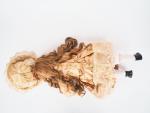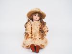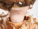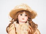 Poupée Jumeau période SFBJ moule 1907, tête porcelaine, yeux fixes bruns, bouche ouverte, oreille percée, porte la marque en creux 1907 et 8. Dim. 49 cm