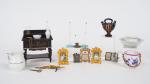 Eléments miniatures pour une maison de poupées dont porte photo, bougeoirs, pendentifs souvenir etc. le tout en état d'usage, on y joint une table de toilette et quelques pièces de service de toilette (petit broc accidenté).
