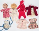 Petit lot de vêtements dans le style de Bleuette pour certains anciens pour d'autres récents copie du tablier enfants sage, au totale : 7 pièces on y joint un costume d'hiver pour Bambino avec moufles et 2 chapeaux de paille.