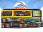 HORNBY. Coffret contenant une locomotive 231 SNCF avec son tender, le transformateur, les rails et les deux voitures voyageurs.