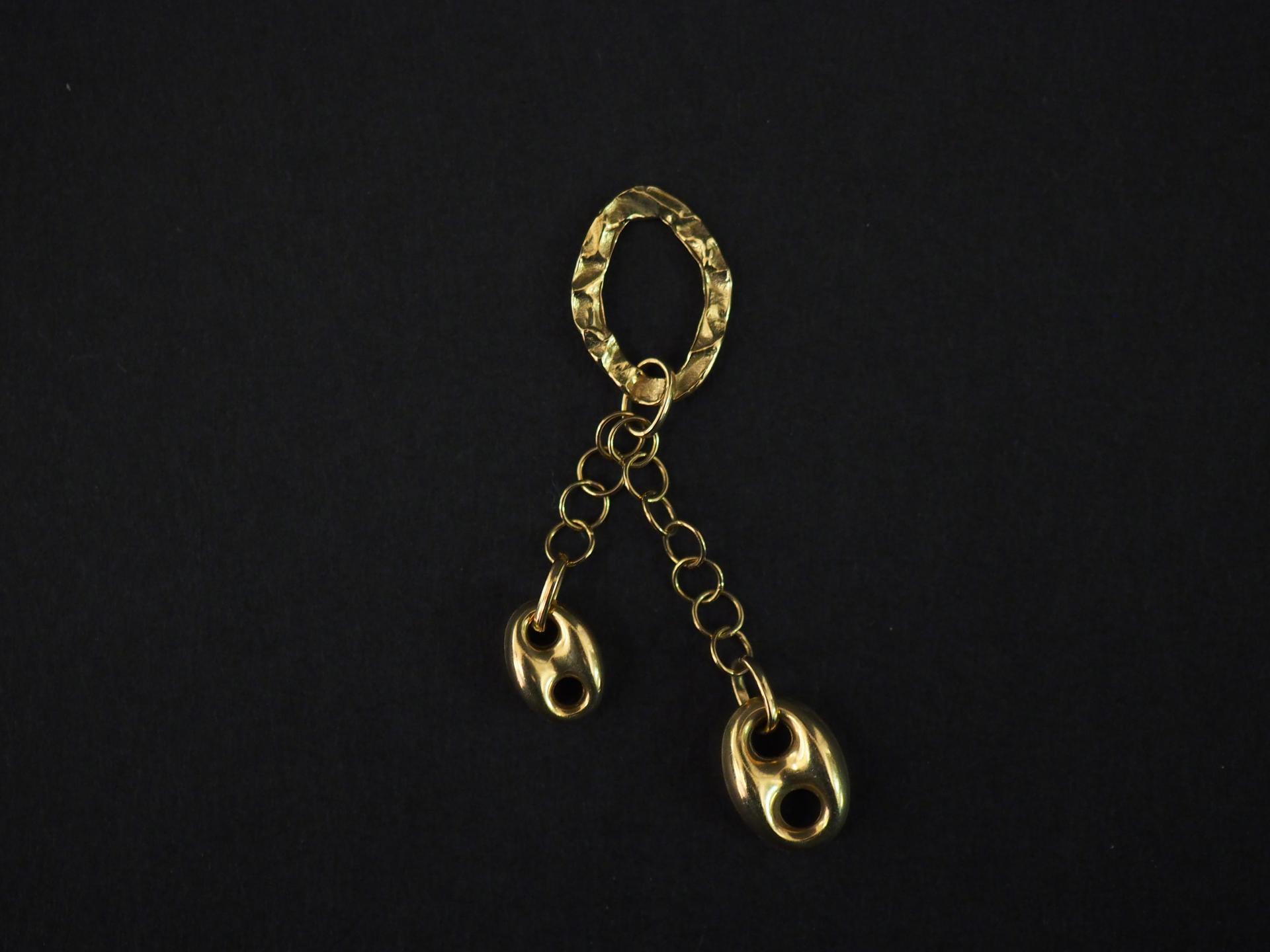 Pendentif en or jaune composé d'un motif ajouré et martelé de forme ovale d'ou découlent deux pendeloques se terminant par un motif grain de café.