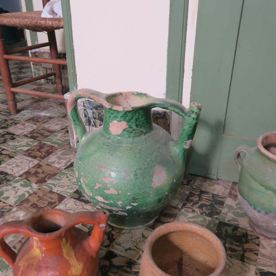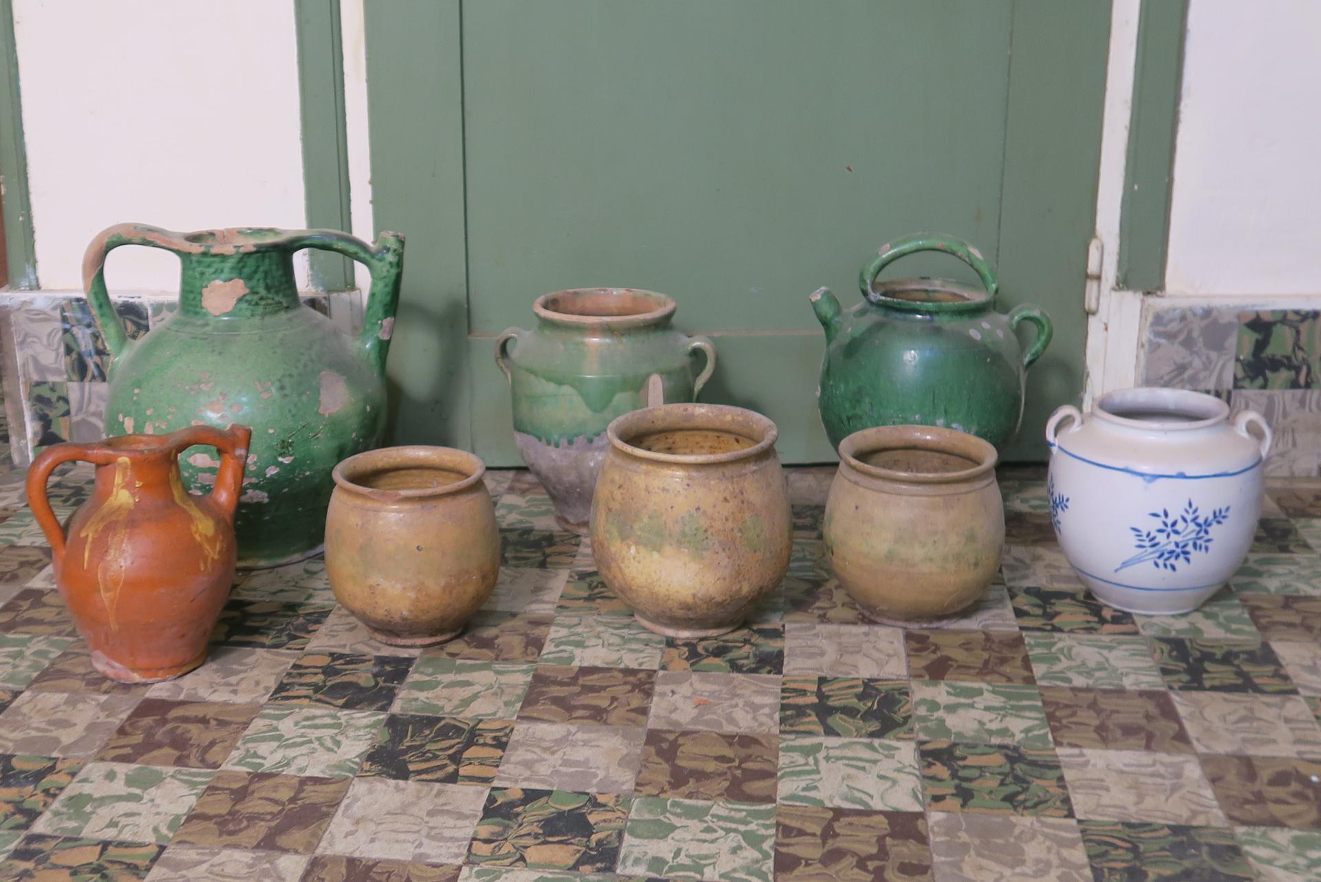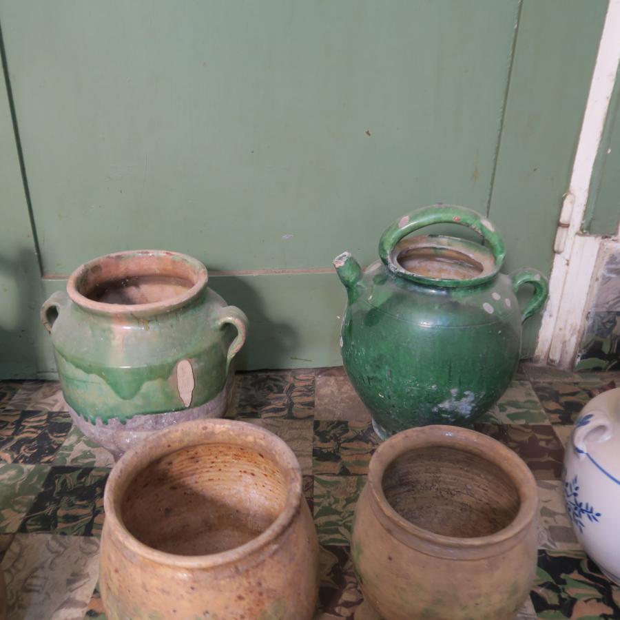 2 chevrettes et un pot à graisse en terre vernissée verte ; on y joint quatre différents pots à graisse et une chevrette.