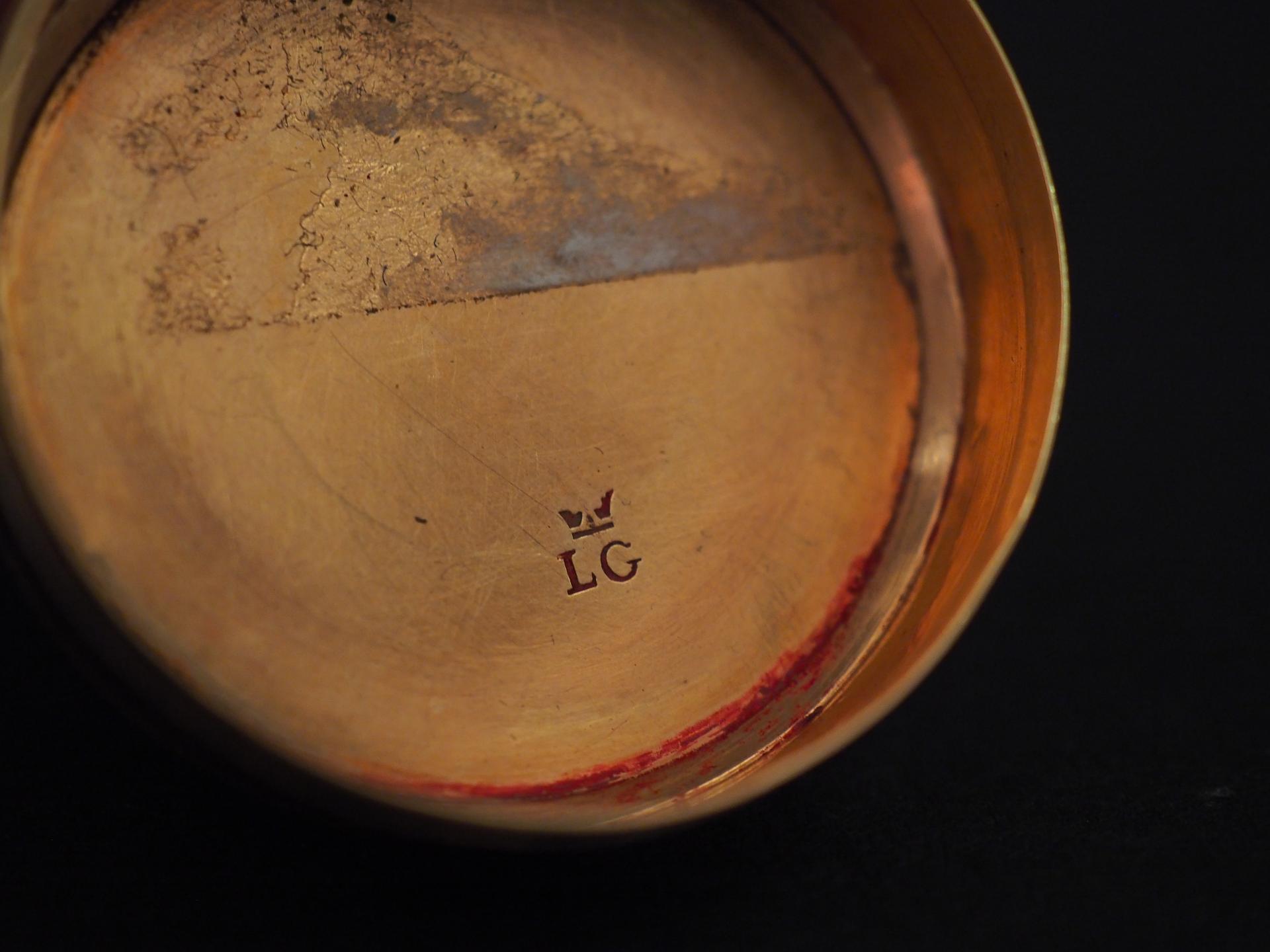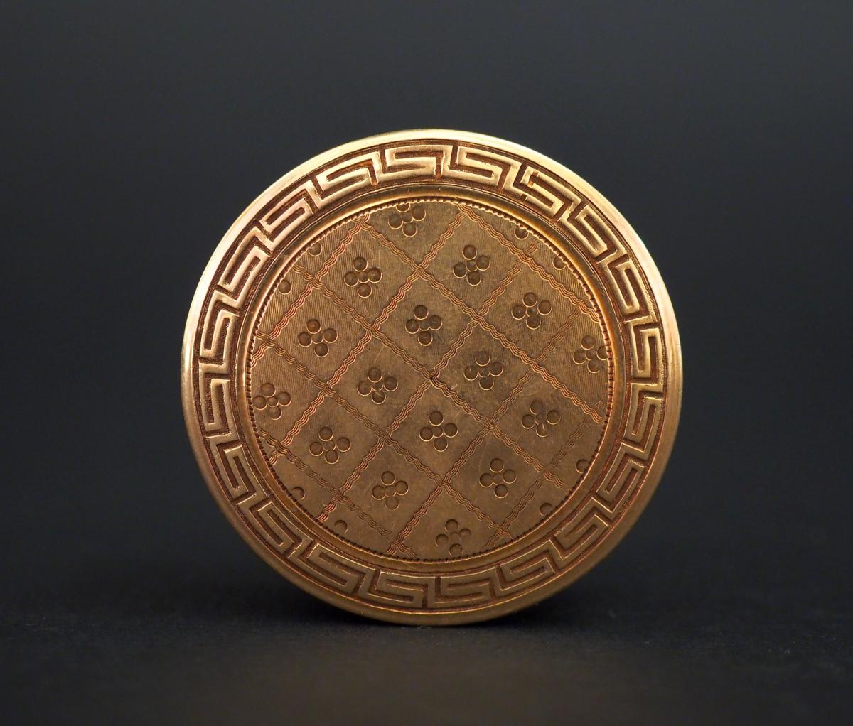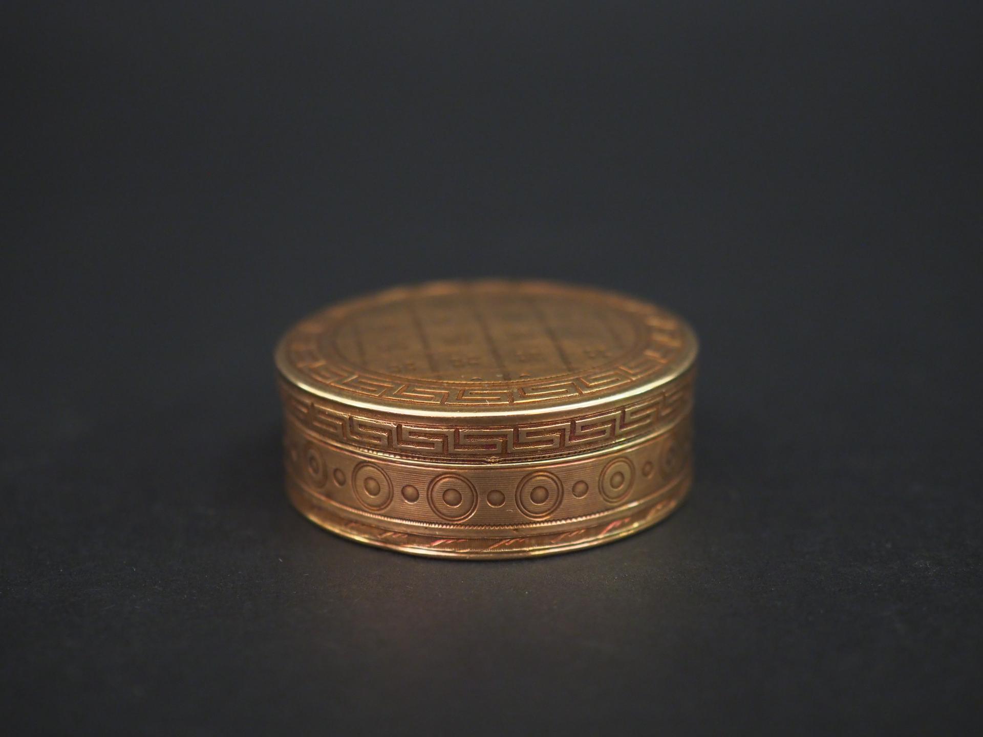 Boite à pilule de style Louis XVI en or jaune 750, à décor de frises de grecques et de fleurs. H. 1,5 cm Diam. 4 cm Poids. 19,96 g