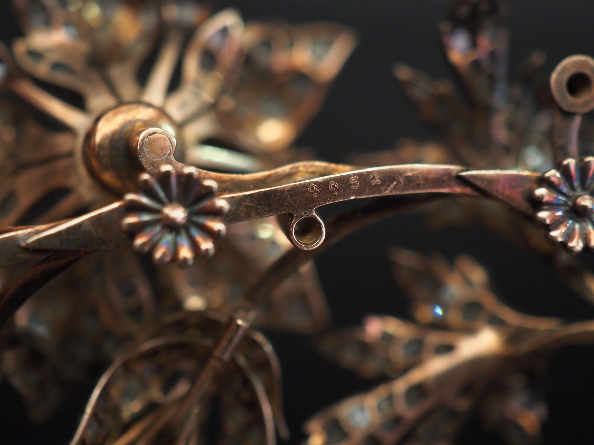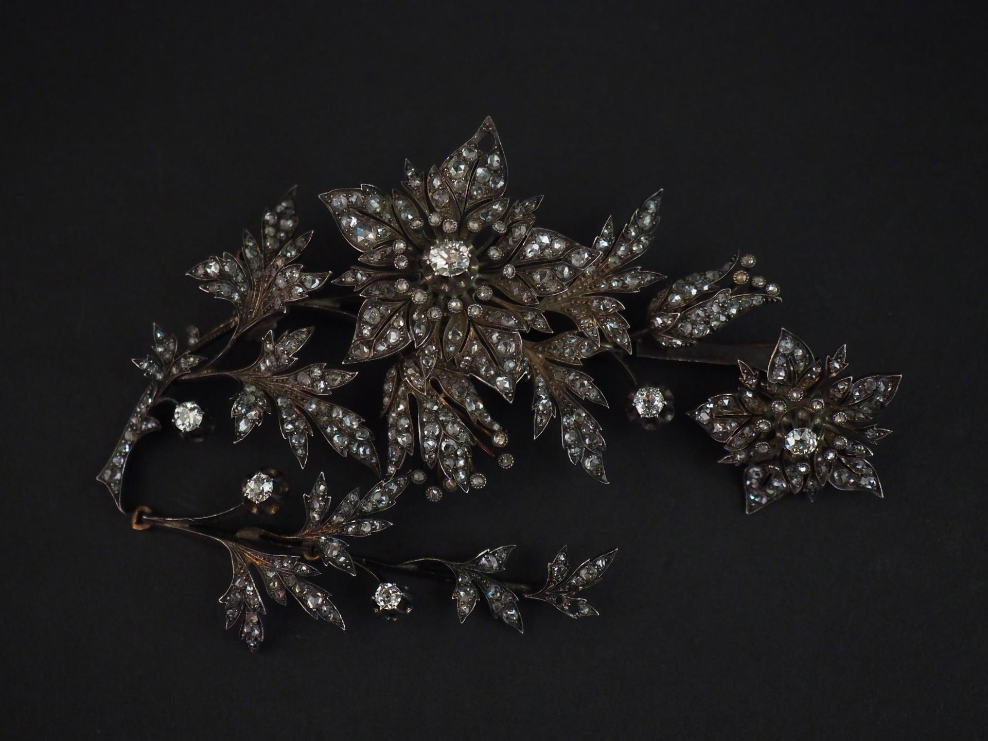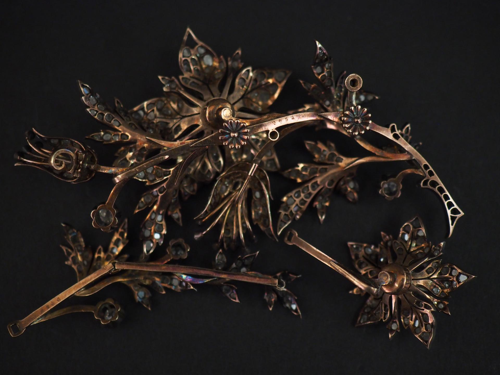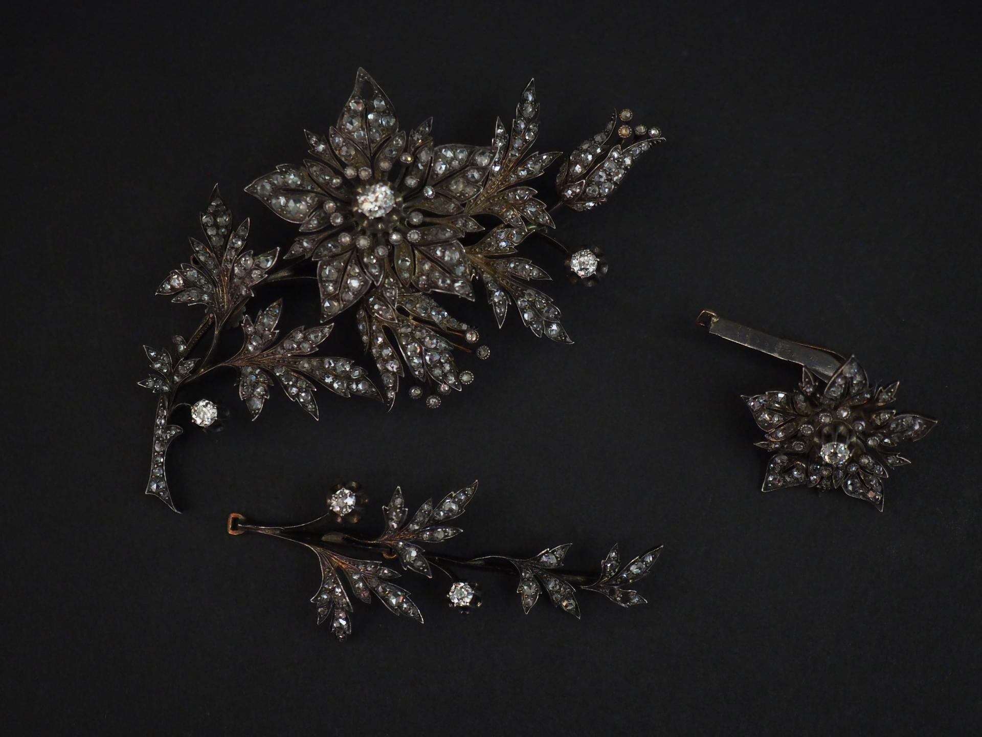 Bijou à transformations comprenant quatre éléments en argent, sertis de diamants taillés en rose en forme de branchage fleuri.