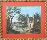 Ecole francaise début XIXème. "Jeunes paysans devant leur chaumière". Gouache sur papier. Dim. (à vue) : 35,5 x 43,5 cm.