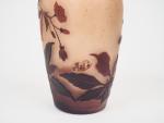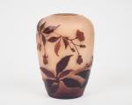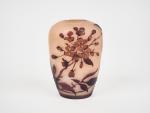 GALLE. Petit vase ovoïde en verre, à décor gravé en camée à l'acide de fleurs mauves sur fond blanc rosé. Signé. H. 12 cm (petites égrenures au col)