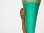 Vase en verre givré vert, à décor de fleurs et de feuillage, agrémenté d'un serpent en métal entourant le vase, la tête de l'animal ornée de pierres de couleur.