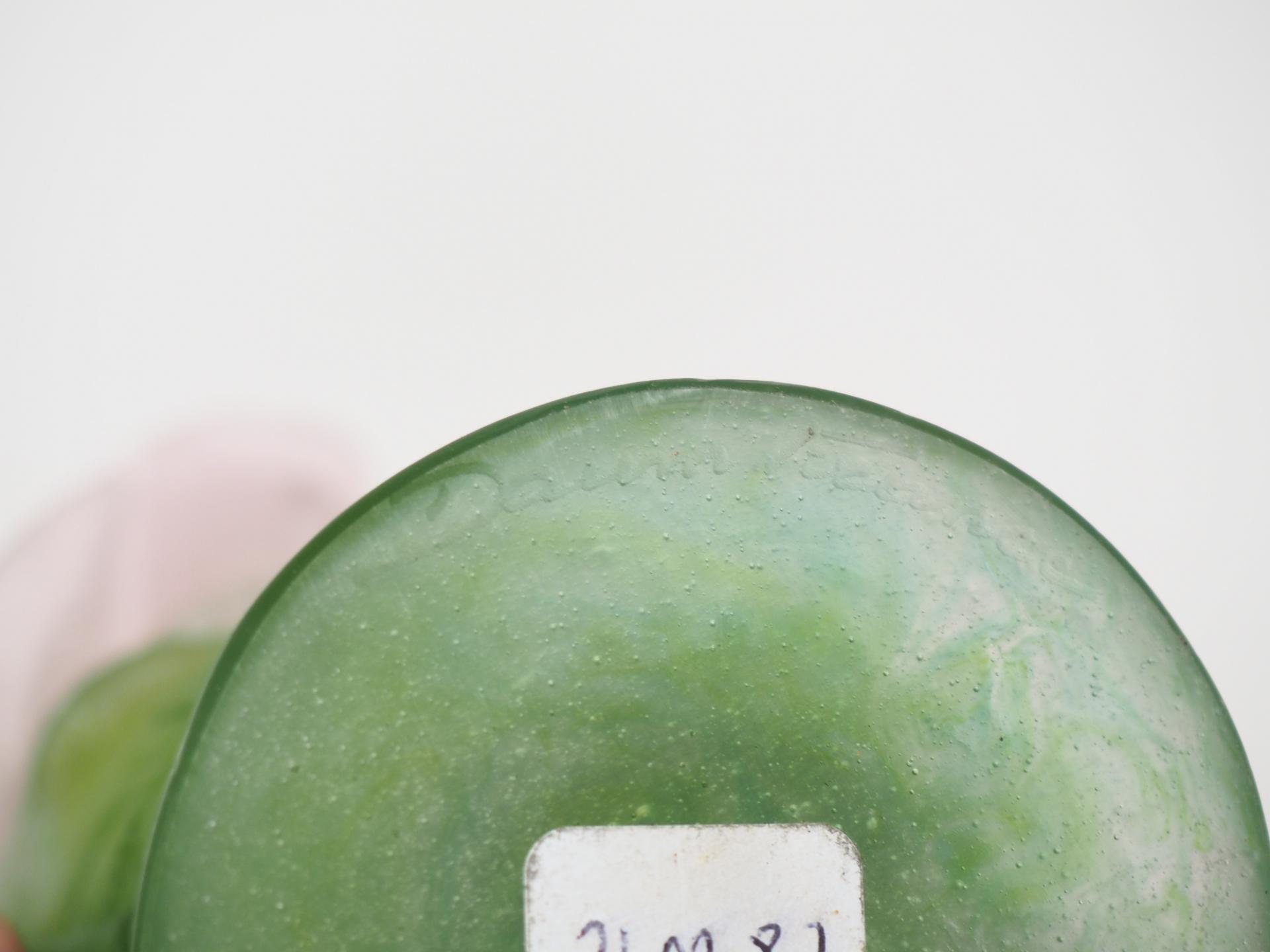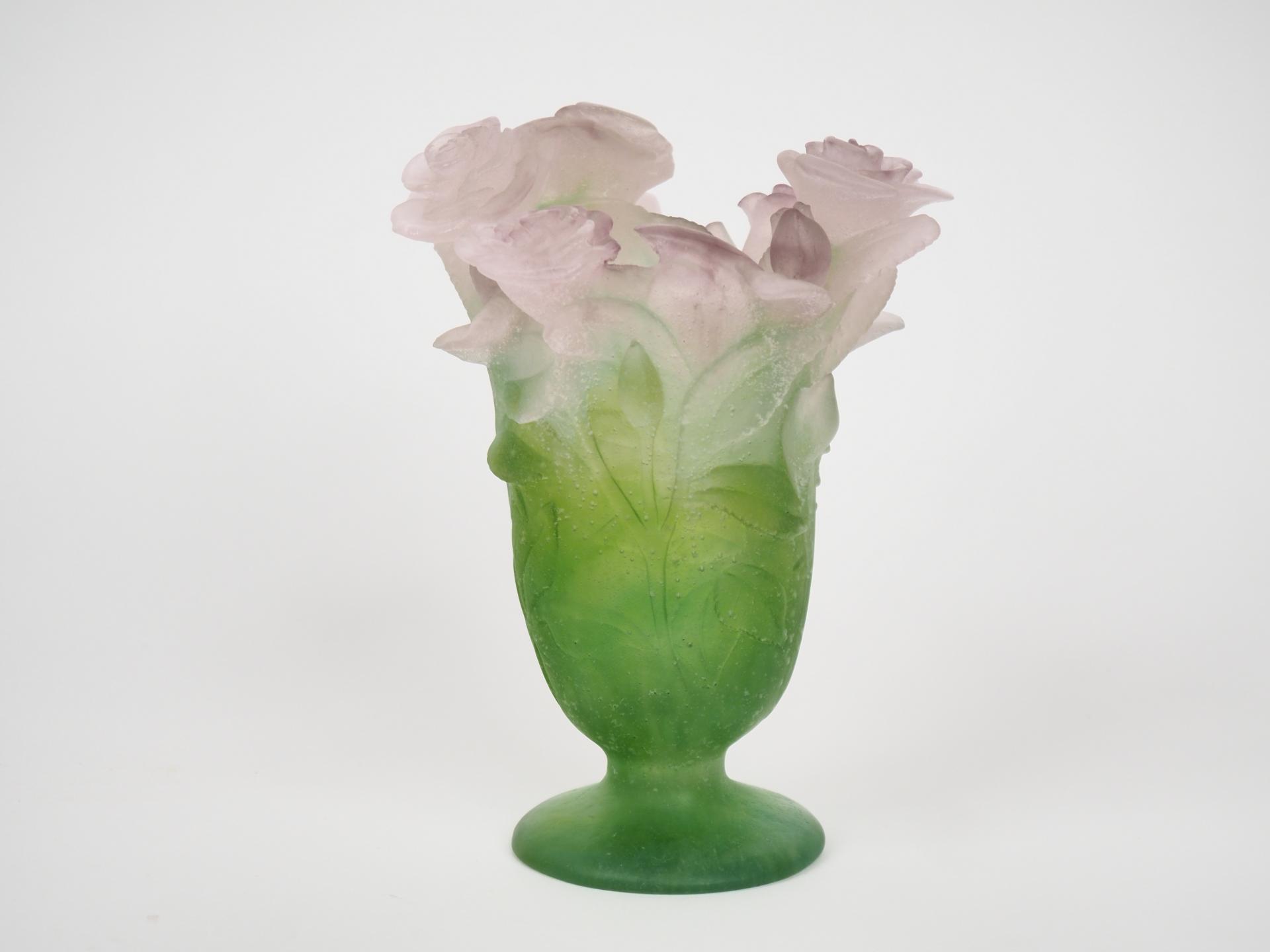 DAUM. Vase en pate de verre polychrome verte et parme, à décor de bouquet de roses en relief. Signé H. 18 cm