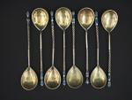 Quatre paires à différents décors du dos du cuilleron, tous à motif floral en émail cloisonné polychrome sur fond émaillé, le bord de perle en émail. L'intérieur du cuilleron en vermeil. Le manche, en partie torsadé est terminé par un petite section en émail cloisonné.