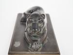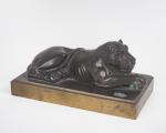 Ecole francaise fin XIXème début XXème. "Lionne couchée". Sujet en bronze à patine verte, sur un socle en laiton. Dim. 8,5 x 18 x 10 cm.