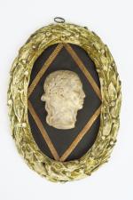 Sujet d'après l'antique en marbre "Profil de César" dans un cadre médaillon en stuc. 28,5 x 20 cm