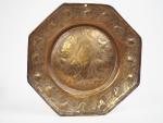 Plat à offrandes XIXème en laiton gravé et repoussé "Vénus et Cupidon". Dim. 41 X 41 cm (percé)