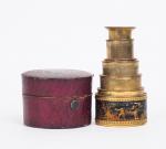 Longue-vue début XIXème en laiton gainé de cuir à décor d'angelots, dans son étui en cuir rouge. H. 9 cm. (Petites usures).