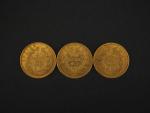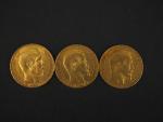 Trois pièces de 20 Francs or, 1854-A, 1857-A et 1860-BB. FRAIS ACHETEURS 10% HT.