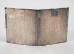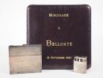 Dans son coffret en cuir bordeaux, titré en lettres d'or : "Bordeaux à Bellonte 18 Novembre 1930". Etui à cigarettes Art Déco en argent et vermeil, poincon Minerve, gravé à l'intérieur : Bordeaux à Bellonte 18 Novembre 1930.