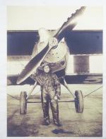 Reproduction de photographie en noir et blanc. "pilote devant son avion"