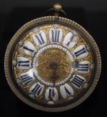 Cadran : métal doré avec cartouches en émail blanc pour l'indication des heures en chiffres romains et arabes pour les minutes, indication des heures et demi sur chemin de fer au centre, carré de remontage (accidents)