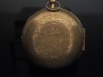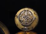 Boitier : rond sur charnière, le dos décoré de motifs feuillagés et de rinceaux sur un fond finement martelé, lunette cannelée (usures)