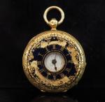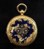 Ravissante petite montre de col Napoléon III demi savonnette en or jaune 750 et émail bleu nuit.