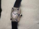 Ravissante montre bracelet de style Art déco en or blanc 750, sertie de diamants taillés en rose et de saphirs calibrés.