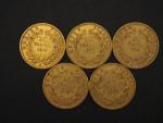 Cinq pièces de 20 Francs or, 1857-A (x2) et 1858-A (x3). FRAIS ACHETEURS 10% HT.